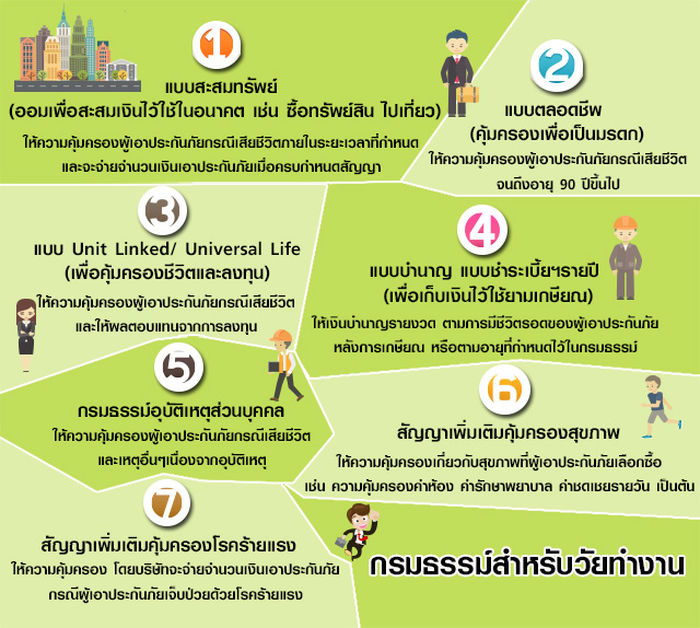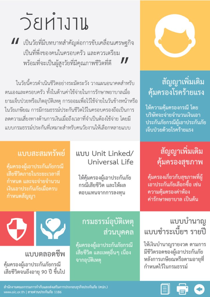 วัยทำงานเป็นวัยที่มีบทบาทสำคัญต่อการพัฒนาเศรษฐกิจ และสังคมของประเทศ เป็นกลไกขับเคลื่อนผลผลิตของเศรษฐกิจ และยังเป็นที่พึ่งของคนในครอบครัว คนในวัยนี้จึงควรให้ความสนใจ ใส่ใจกับการดูแลสุขภาพของตนให้แข็งแรงอยู่เสมอ ไม่ทำงานจนลืมดูแลสุขภาพ และต้องเตรียมพร้อมที่จะเป็นผู้สูงวัยที่มีคุณภาพชีวิตที่ดี พึ่งตัวเองให้ได้มากที่สุด และเป็นภาระสังคมน้อยที่สุดวัยทำงานเป็นวัยที่มีการเสียชีวิตมากที่สุด ไม่ว่าจะด้วยสาเหตุจากการเจ็บป่วยด้วยโรคร้าย อุบัติเหตุจากการขนส่ง หรืออุบัติเหตุจากการทำงาน ในแต่ละปีมีผู้บาดเจ็บ ทุพพลภาพ และตาย จากการทำงาน ทั้งในภาคอุตสาหกรรม และภาคเกษตรกรรมเพิ่มขึ้นอย่างต่อเนื่อง ผู้ที่อยู่ในวัยทำงานจึงควรดำเนินชีวิตอย่างระมัดระวัง วางแผนอนาคตสำหรับตนเองและครอบครัว ทั้งในด้านค่าใช้จ่ายในการรักษาพยาบาลเมื่อยามเจ็บป่วยหรือเกิดอุบัติเหตุ การออมเพื่อไว้ใช้จ่ายในวันข้างหน้าหรือในวัยเกษียณ การมีกรมธรรม์ประกันชีวิตไว้ในครอบครองเป็นการลดความเสี่ยงทางด้านการเงินเมื่อถึงเวลาที่จำเป็นต้องใช้จ่าย เราลองมาดูประเภทของกรมธรรม์ที่เหมาะสมสำหรับวัยทำงานกัน