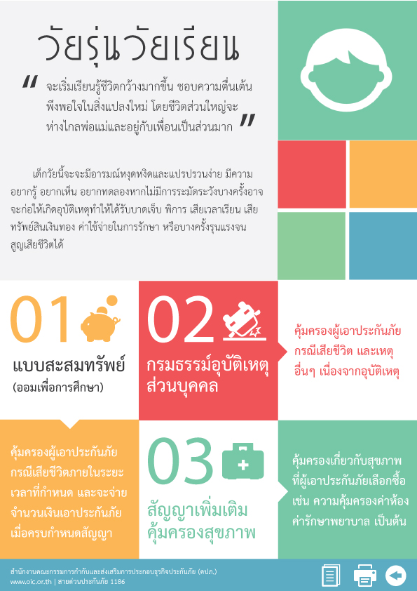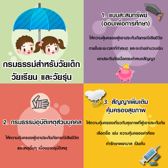 เด็กในวัยเรียนจะเริ่มนับจากเด็กที่เรียนตั้งแต่ชั้นประถมศึกษาปีที่ 1 ถึง มัธยมศึกษาปีที่ 3 จะเริ่มเรียนรู้ชีวิตกว้างมากขึ้น ชอบความตื่นเต้น พึงพอใจในสิ่งแปลกใหม่ และเมื่อเริ่มเข้าสู่ช่วงวัยรุ่น เด็กหญิงจะเข้าสู่ช่วงวัยรุ่นเร็วกว่าเด็กชาย 2 ปี ในช่วงนี้ร่างกายของเด็กจะมีพัฒนาการเข้าสู่วัยผู้ใหญ่ จะเริ่มมีอารมณ์หงุดหงิดง่าย แปรปรวน อยากรู้อยากเห็น อยากทดลอง เด็กในวัยเรียนถึงวัยรุ่น มักจะติดเพื่อน การเล่นกีฬา หรือการเดินทางไปโรงเรียน หากไม่ระมัดระวังก็อาจก่อให้เกิดอุบัติเหตุได้กับทั้ง 2 ช่วงวัยข้างต้น ผู้ปกครองสามารถมอบอนาคตที่ดีให้กับบุตรได้ด้วยการวางแผนการออมตั้งแต่วัยเด็ก เพื่อเป็นทุนการศึกษา เป็นค่ารักษาพยาบาลในยามเจ็บป่วยหรือเกิดอุบัติเหตุ ซึ่งจะช่วยแบ่งเบาภาระค่าใช้จ่ายตามแต่ละช่วงสถานการณ์ได้อีกด้วย เราลองมาดูกันนะคะว่าจะมีกรมธรรม์แบบไหนบ้างที่เหมาะสมสำหรับวัยเด็ก วัยเรียน และวัยรุ่น